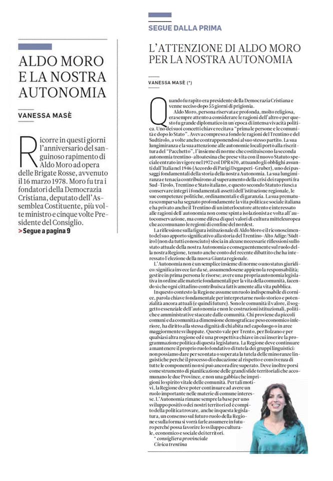 “L’Autonomia non è un semplice insieme di norme o uno status giuridico: significa invece far da sè, assumendosene appieno la responsabilità; gestire in prima persona le risorse, avere una propria autonomia legislativa in ordine alle materie fondamentali per la vita della Comunità , facendo così che ogni cittadino contribuisca fattivamente alla vita pubblica.” Così interviene oggi sulla stampa la Cons. Vanessa Masè in un suo editoriale.