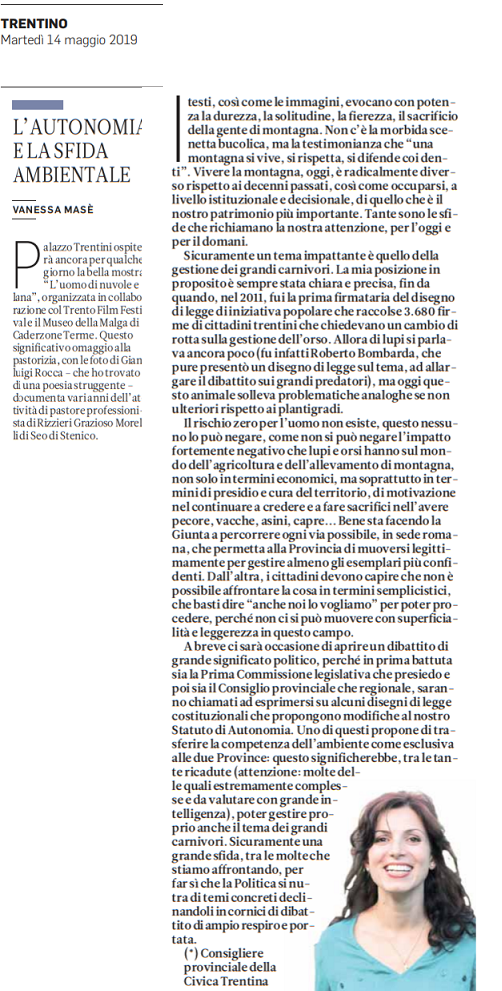 Dal quotidiano Il Trentino del 15 maggio 2019. *Cons. Vanessa Masè