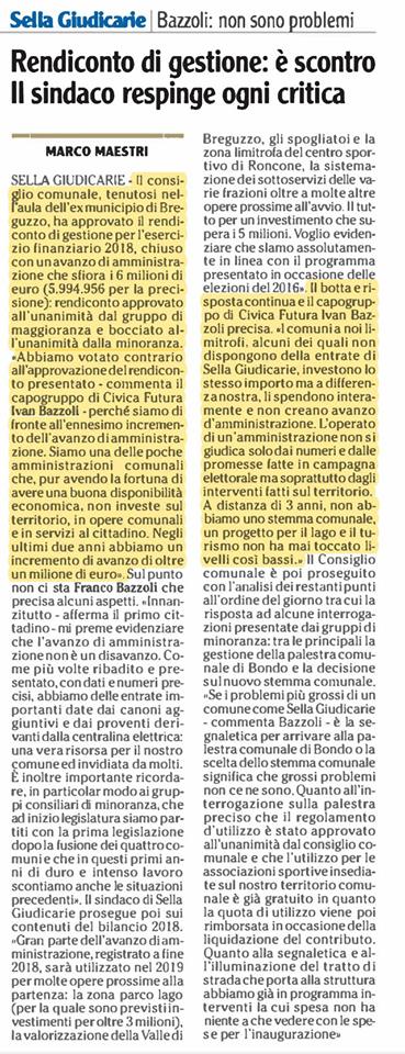 Il quotidiano l’Adige riprende la nostra dichiarazione di voto dell’ultimo consiglio riguardante il rendiconto di gestione 2018 chiuso con un avanzo d’amministrazione che sfiora la cifra record di 6 milioni di euro!