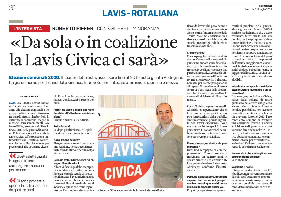 Roberto Piffer, Capogruppo di Lavis Civica e fondatore del nostro Movimento, interviene sulla stampa locale esponendo la posizione in vista delle elezioni amministrative del 2020 di Lavis.