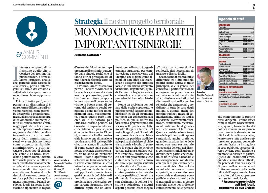 Interessante spunto di riflessione quello che il Corriere del Trentino ha pubblicato ieri, a firma del Prof. Brunazzo, analisi che, partendo dalla nascita de La Civica, porta ad interrogarsi sul ruolo del civismo e sull’identità che questi movimenti dovrebbero rappresentare.