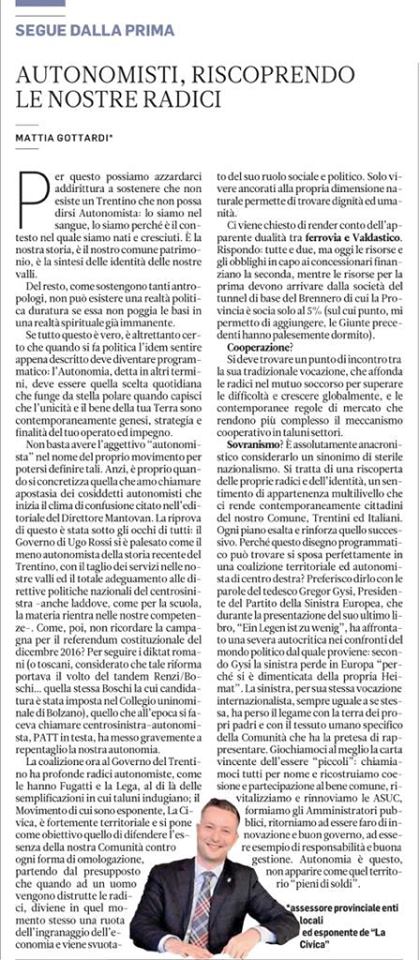 La coalizione ora al Governo del Trentino ha profonde radici autonomiste, come le hanno Fugatti e la Lega, al di là delle semplificazioni in cui taluni indugiano; il Movimento di cui sono esponente, La Civica, è fortemente territoriale e si pone come obiettivo quello di difendere l’essenza della nostra Comunità contro ogni forma di omologazione, partendo dal presupposto che quando ad un uomo vengono distrutte le radici, diviene in quel momento stesso una ruota dell’ingranaggio dell’economia e viene svuotato del suo ruolo sociale e politico. Solo vivere ancorati alla propria dimensione naturale permette di trovare dignità ed umanità.