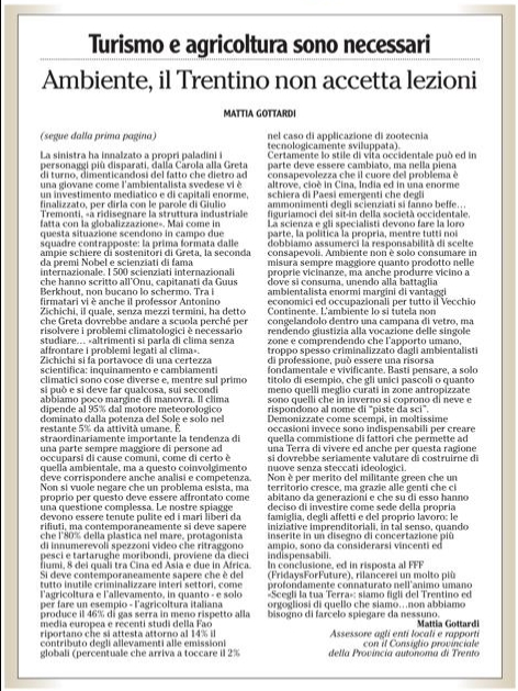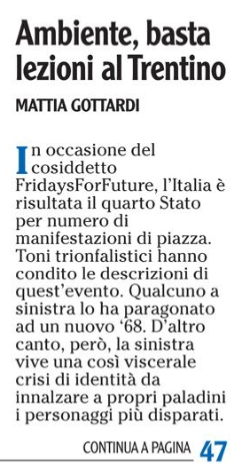 Di seguito la lettera pubblicata sul quotidiano L’Adige del 10 ottobre 2019