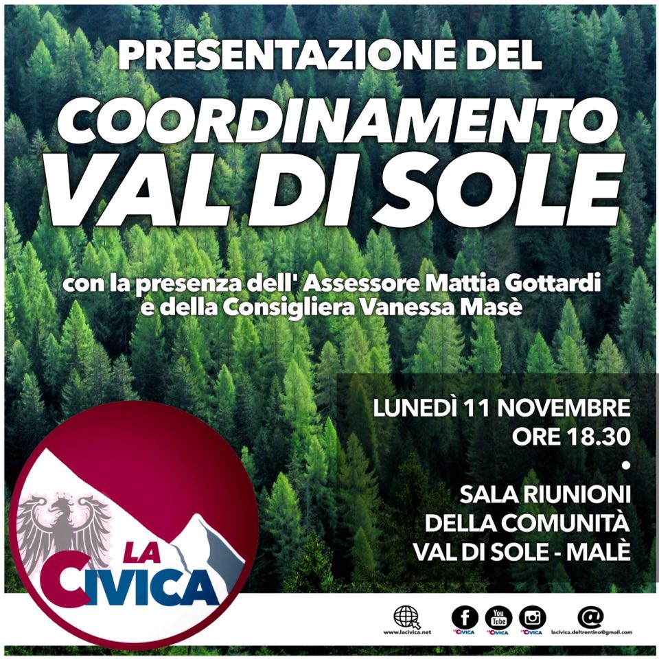 La Civica, Movimento politico nato ufficialmente a luglio di quest’anno, si presenta anche in Val di Sole con una conferenza stampa nella quale verranno illustrati gli impegni programmatici e la struttura che si muoverà nel territorio solandro.
