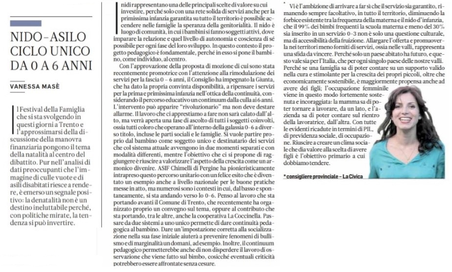 Vi è l’ambizione di arrivare a far si che il servizio sia garantito, rimanendo sempre facoltativo, in tutto il territorio, diminuendo la forbice esistente tra la frequenza della materna e il nido d’infanzia, che il 99% dei bimbi frequenti la scuola materna e meno del 30% sia inserito in un servizio 0-3 non è solo una questione culturale, ma di accessibilità della fruizione. Allargare l’offerta e promuoverla nei territori meno forniti di servizi, ossia nelle valli, rappresenta una sfida da vincere, ripensando, come a mio avviso l’attuale governo provinciale sta facendo, le politiche familiari ponendole al centro delle politiche di sviluppo. Perchè solo un paese abitato ha futuro, e questo vale sia per l’Italia, che per ogni singolo paese delle nostre valli. Perchè se una famiglia sa di poter contare su un supporto valido nella cura e stimolante per la crescita dei propri piccoli, oltre che economicamente sostenibile, è maggiormente propensa anche ad avere dei figli; l’occupazione femminile viene in questo modo fortemente sostenuta e incoraggiata: la mamma sa di poter tornare a lavorare, da un lato, e l’azienda sa di poter contare sul rientro della lavoratrice, dall’altra. Con tutte le evidenti ricadute in termini di PIL, di previdenza sociale, di occupazione. Riuscire a creare un clima sociale che dia valore alla scelta di avere figli, in cui un figlio da costo privato diventi bene comune da condividere tutti insieme per darci un futuro, è l’obiettivo primario a cui dobbiamo tendere.