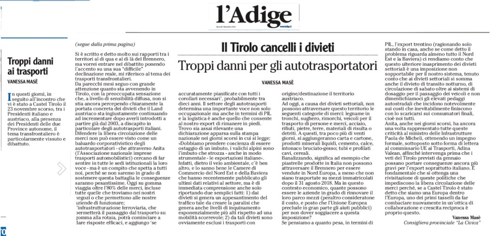 Da parecchi mesi seguo con grande attenzione quanto sta avvenendo in Tirolo, con la preoccupata sensazione che, a livello di sensibilità diffusa, non si stia ancora percependo chiaramente la portata concreta dei divieti che il Land austriaco sta ingiustamente continuando ad incrementare dopo averli introdotti a partire già dal 2003, a discapito in particolare degli autotrasporti italiani. Difendere la libera circolazione delle merci non può essere visto come un baluardo corporativistico degli autotrasportatori – che attraverso Anita (l’Associazione Nazionale Imprese Trasporti Automobilistici) cercano di far sentire in tutte le sedi istituzionali la loro voce – ma è un compito che spetta a tutti noi, perché se non saremo in grado di sostenere questa battaglia le conseguenze saranno pesantissime. Oggi su gomma viaggia oltre l’80% delle merci, incluse tutte quelle che troviamo nei nostri negozi o che permettono alle nostre aziende di funzionare; l’infrastrutturazione ferroviaria, che permetterà il passaggio dal trasporto su gomma alla rotaia, potrà cominciare a dare risposte efficaci, e aggiungo ‘se accuratamente pianificate con tutti i corollari necessari’, probabilmente tra dieci anni. Il settore degli autotrasporti determina una importante voce non solo occupazionale ma anche in termini di PIL e la logistica è anche quello che consente al nostro export di rimanere in piedi. Trovo sia assai rilevante una dichiarazione apparsa sulla stampa nazionale nei giorni scorsi in cui si legge: “dobbiamo prendere coscienza di essere ostaggio di un imbuto, i valichi alpini sono l’imbuto che strozza – anche in modo strumentale – le esportazioni italiane”. Infatti, dietro il velo ambientale, c’è ben altro, e lo sanno bene le Camere di Commercio del Nord Est e della Baviera che hanno recentemente pubblicato gli ultimi dati relativi al settore, ma è di immediata comprensione anche solo riportando due semplici fatti: 1) dai divieti si genera un appesantimento del traffico tale da creare la paralisi che genera anche livelli di inquinamento esponenzialmente più alti rispetto ad una mobilità scorrevole; 2) da tali divieti sono ovviamente esclusi i trasporti con origine/destinazione il territorio austriaco. Ad oggi, a causa dei divieti settoriali, non possono attraversare questo territorio le seguenti categorie di merci: legname in tronchi, sughero, rimorchi, veicoli per il trasporto di persone e merci, acciaio, rifiuti, pietre, terre, materiali di risulta o detriti. A questi, tra poco più di venti giorni, si aggiungeranno carta e cartone, prodotti minerali liquidi, cemento, calce, intonaco bruciato-gesso; tubi e profilati cavi, cereali. Banalizzando, significa ad esempio che piastrelle prodotte in Italia non possono attraversare il Brennero per essere vendute in Nord Europa, a meno che non siano trasportate su mezzi immatricolati dopo il 31 agosto 2018. Ma in questo contesto economico, quante possono essere le aziende in grado di rinnovare il loro parco mezzi (peraltro consideratone il costo, e posto che l’Unione Europea preclude in gran parte gli aiuti pubblici) per non dover soggiacere a questa imposizione? Se pensiamo a quanto pesa, in termini di PIL, l’export trentino (ragionando solo stando in casa, anche se come detto il problema riguarda almeno tutto il Nord Est e la Baviera) ci rendiamo conto che questo ulteriore inasprimento dei divieti settoriali è una imposizione non sopportabile per il nostro sistema, tenuto conto che ai divieti settoriali si somma anche il divieto di transito notturno, di circolazione di sabato oltre ai sistemi di dosaggio per il passaggio dei veicoli e non dimentichiamoci gli elevati pedaggi autostradali che incidono notevolmente sui costi che inevitabilmente finiscono con lo scaricarsi sui consumatori finali, cioè noi tutti. Anita, anche nei giorni scorsi, ha ancora una volta rappresentato tutte queste criticità al ministro delle Infrastrutture Paola de Micheli, ottenendo un impegno formale, sottoposto sotto forma di lettera al commissario UE ai Trasporti, Adina Valean, affinché intervenga prima che i veti del Tirolo previsti da gennaio possano portare conseguenze ancora più gravi per l’export soprattutto italiano. È fondamentale che si ottenga una rivisitazione di queste politiche che impediscono la libera circolazione delle merci perché, se a Castel Tirolo è stato detto che siamo una Europa dentro l’Europa, uno dei primi tasselli da far combaciare nuovamente in un’ottica di collaborazione e crescita reciproca è proprio questo.