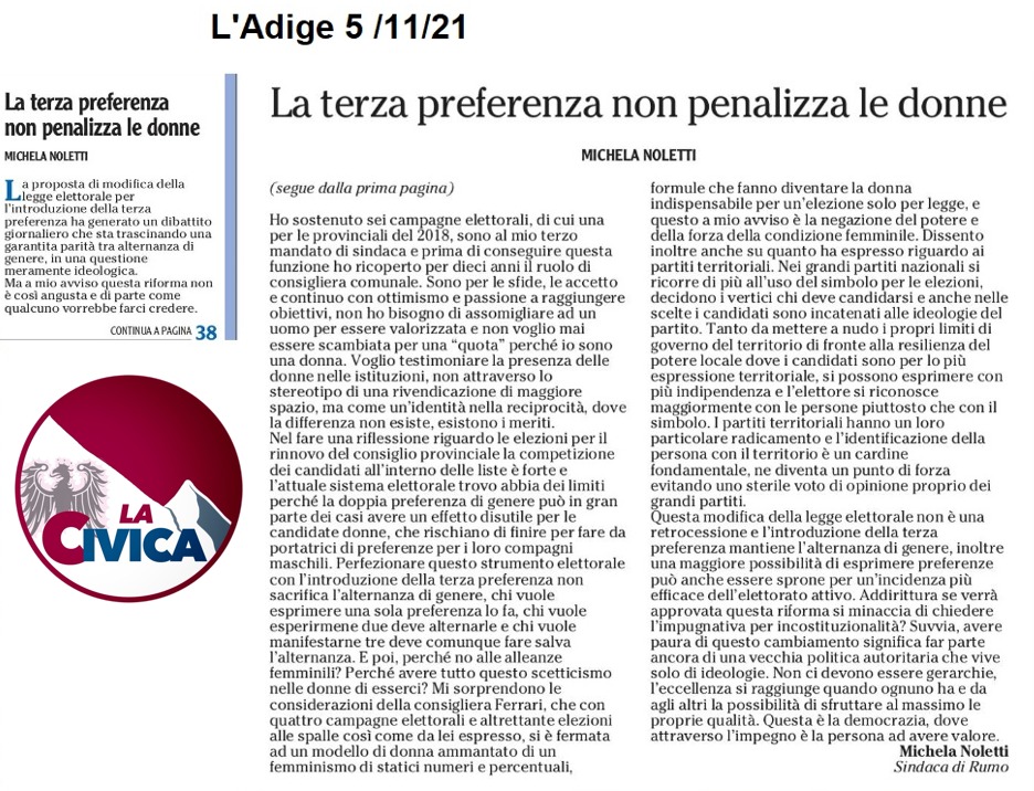 Michela Noletti – Sindaco di Rumo :” Voglio testimoniare la presenza delle donne nelle istituzioni, non attraverso lo stereotipo di una rivendicazione di maggiore spazio, ma come un’identità nella reciprocità, dove la differenza non esiste, esistono i meriti “