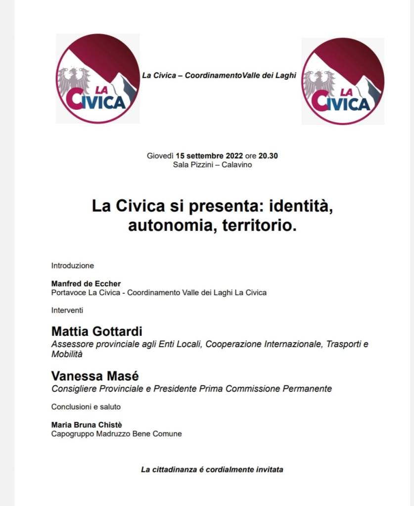 Il coordinamento territoriale Valle dei Laghi La Civica presenterà la propria attività il giorno 15 settembre 2022